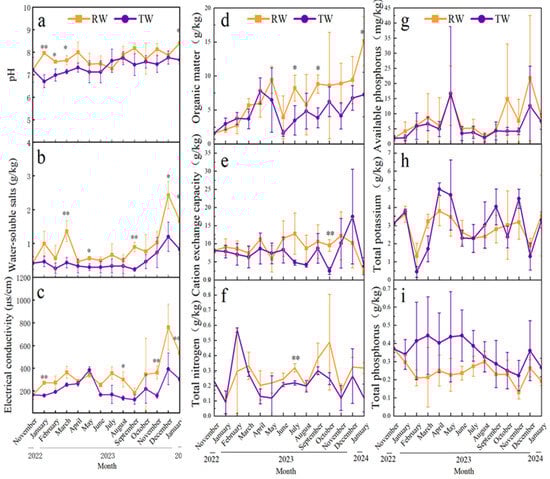 Soil properties in RW and TW plots: (a) pH; (b) water-soluble salt concentrations; (c) electricity conductivity; (d) soil organic matter; (e) cation exchange capacity; (f) total nitrogen; (g) available phosphorus; (h) total potassium; (i) total phosphorus. Asterisks indicate significant differences: * p < 0.05; ** p < 0.01. Error bars represent standard error.