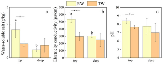 Comparison of soil properties in the top (0–20 cm) and deep (20–40 cm) soil layers of RW and TW plots on 18 January 2024: (a) water-soluble salt concentrations; (b) electrical conductivity; and (c) pH. Means were compared using t-test with a significance level of 0.05: * p < 0.05 and ** p < 0.01. Different lowercase letters indicate significant differences between RW and TW plots within each soil depth.