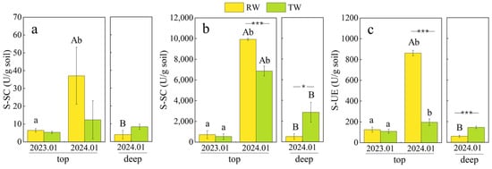 Soil enzyme activities in RW and TW plots in January 2023 and January 2024: (a) soil saccharase (S-SC); (b) soil acid phosphatase (S-ACP); (c) soil urease (S-UE). Means were compared using t-test with a significance level of 0.05: * p < 0.05, and *** p < 0.001. Different lowercase letters represent significant differences between months, while different uppercase letters indicate significant differences between topsoil and deep soil. Letters are not shown when no significant difference was detected.