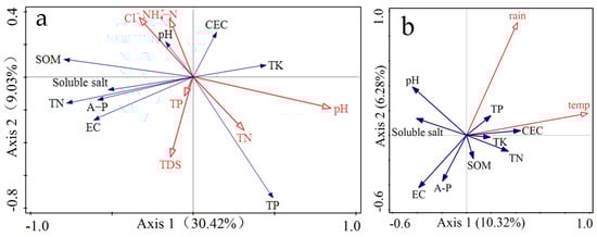 RDA of soil properties (blue arrows): (a) with RW variables (red arrows) and (b) with rainfall and temperature variables (red arrows). Soil parameters include pH, soil organic matter (SOM), total nitrogen (TN), total phosphorus (TP), total potassium (TK), available phosphorus (A-P), cation exchange capacity (CEC), electrical conductivity (EC), and water-soluble salt; RW parameters include pH, ammonia nitrogen (NH4+-N), total dissolved solids (TDS), chloride (Cl−), TP, and TN.