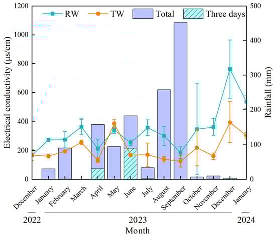 Monthly variations of electrical conductivity and rainfall from 2023 to 2024 (n = 3). “Total” rainfall represents the cumulative amount between the previous and current sampling dates. “Three days” rainfall represents the cumulative amount in the three days prior to each sampling date. Electrical conductivity values for RW and TW plots were compared monthly using t-test.