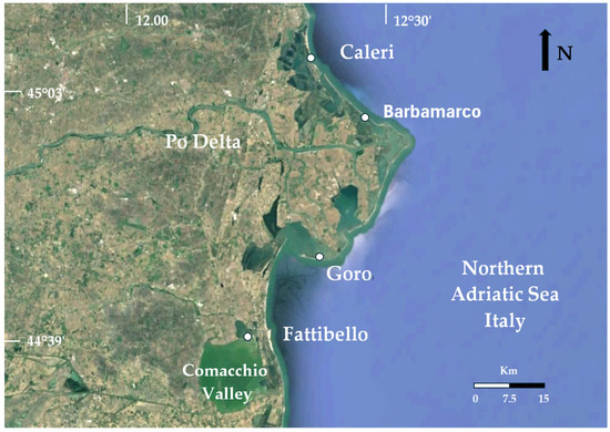 The Po Delta (44°57′ N, 12°23′ E) spans a large area within the Veneto and Emilia Romagna Regions (northwestern Adriatic Sea, Italy), covering a water surface of approximately 200 km2, of which only approx. 100 km2 are influenced by tidal expansion. The remaining surface is part of embanked fishing valleys. Before flowing into the sea, the river called Po di Venezia forms a large delta, splitting into five branches: Po di Maestra, Po di Pila, Po di Tolle, Po di Gnocca or di Donzella, and Po di Goro. These branches delineate lagoons and ponds with distinct geomorphological and environmental characteristics, such as those considered in this study: Caleri, Barbamarco, and Goro (Figure 1). Another transitional area was considered in the northernmost part of the Comacchio Valleys, in a pond called Fattibello Valley (44°40′ N, 12°12′ E).