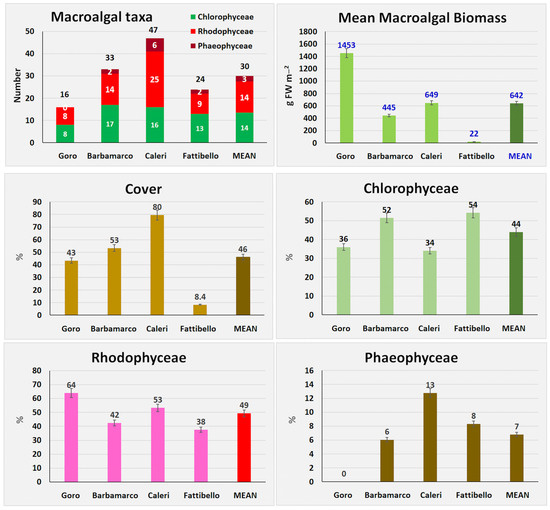The determination of the taxonomic list of macroalgae and aquatic angiosperms, the cover and abundance of Chlorophyceae and Rhodophyceae, the cover of aquatic angiosperms, and the number of macroalgal taxa of high ecological value (sensitive taxa) enabled us to evaluate the ecological status of these lagoons by applying the macrophyte quality index (MaQI). This index was developed and validated for transitional environments of the Mediterranean Sea [25] and calibrated by the European Commission with Greece and France [26].