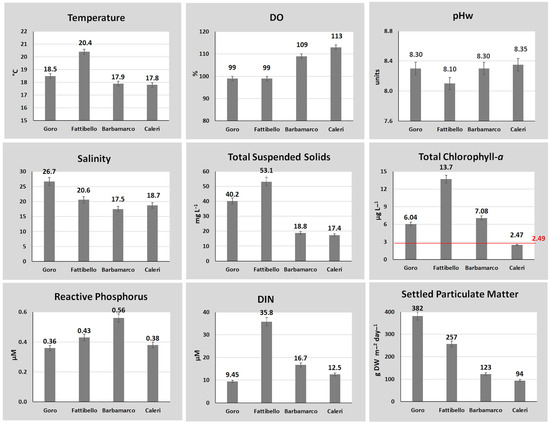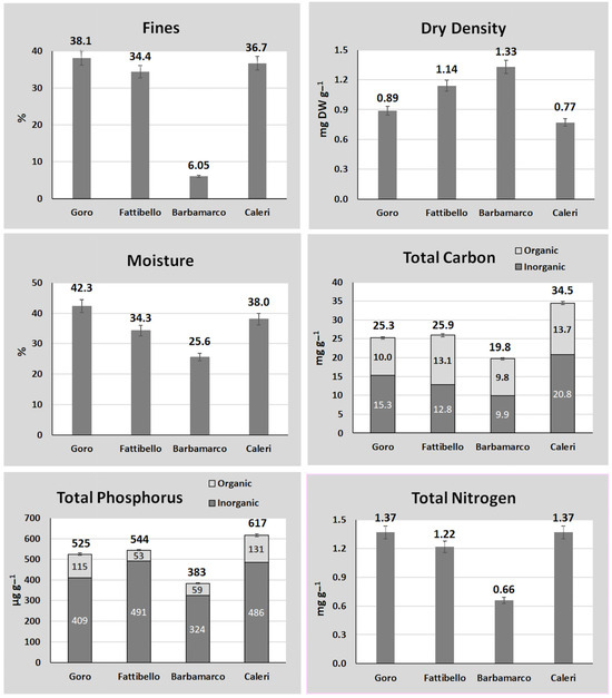 Figure 4 shows the mean values of some parameters in surface sediments. In Barbamarco, sediments were characterized by the lowest percentage of Fines (6.05%) and moisture (25.6%) as well as by the highest dry density (1.33 mg DW g−1). This station also showed the lowest total phosphorus (Ptot = 383 µg g−1), total nitrogen (Ntot = 0.66 mg g−1), and total carbon (Ctot = 19.8 mg g−1) concentrations, whereas nutrient concentrations were highest in Caleri.