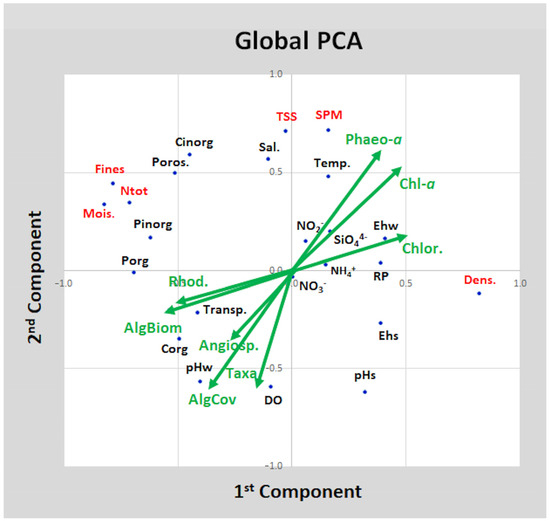 The principal component analysis (PCA) of 32 parameters/variables reveals the variance associated with each parameter/variable (significant loading: p > 0.7) and the associations between macroalgae, aquatic angiosperms, phytoplankton (reported as Chl-a and Phaeo-a concentrations), and water/sediment parameters. The PCA identified nine components explaining 79.2% of the total variance. The first two components (explaining 37% of the variance) are plotted in a plane (Figure 5). On the first axis, the parameters that explain most of the variance on the positive side of the plane were sediment density and, on the negative side, sediment moisture, Fines and Ntot (p > 0.7). On the second axis, the main variance was associated with SPM and TSS. Additionally, in the first axis, minor contributions were from RP, Ehw, Ehs, and, among algae, Chl-a, Phaeo-a, and Chlorophyta abundance on the positive side, with Porg, Pinorg, macroalgal biomass, and Rhodophyceae abundance on the negative side. Similarly, on the second axis, salinity, temperature Cinorg, and Porg contributed mainly to the variance on the positive side, whereas DO, pHs, and pHw, along with macroalgal cover and the number of taxa, contributed to the variance on the negative side.