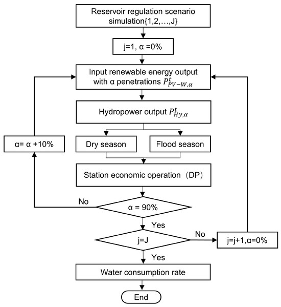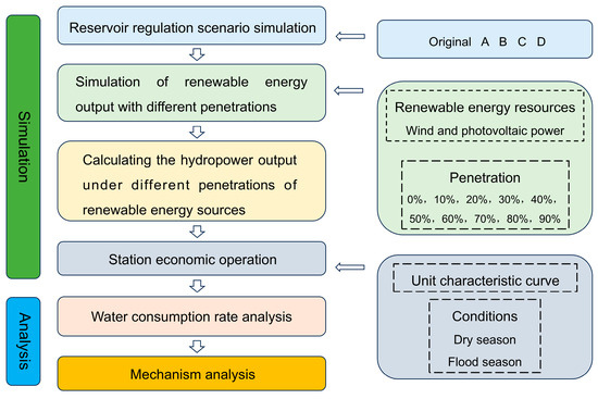 This paper adopts a simulation analysis framework and employs MATLAB R2018b to simulate and calculate. First, set different reservoir regulation ability scenarios. Each scenario’s adjustable water level should be kept constant; only the corresponding reservoir storage is varied. Second, simulate the output process of renewable energy sources with different penetrations. Third, calculate the hydropower output process under different penetrations of renewable energy sources according to the output process of renewable energy. Fourth, simulate the two situations of the dry and flood seasons, and allocate the load to units to achieve the station economic operation. Finally, the water consumption rate is determined, and the mechanism is analyzed. The specific process is shown in Figure 1.