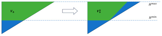where is the reservoir storage corresponding to water level H after the available reservoir storage is scaled to n times the original, 108 m3; m is the reservoir scaling ratio; and are the reservoir storages corresponding to the maximum and minimum water levels, respectively, 108 m3; and are the maximum and minimum water levels in the reservoir, respectively, m; is the available reservoir storage scaled n times, 108 m3; and is the adjustable storage of the original reservoir, 108 m3.