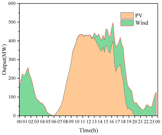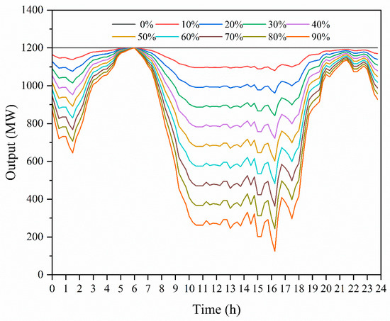 In this study, the key is the influence of the penetration of renewable energy rather than the influence of the proportional relationship between wind and PV sources. Therefore, for the ease of analysis, the renewable energy output was considered as a whole, and the renewable energy output considering different penetrations can be calculated as follows [28]: