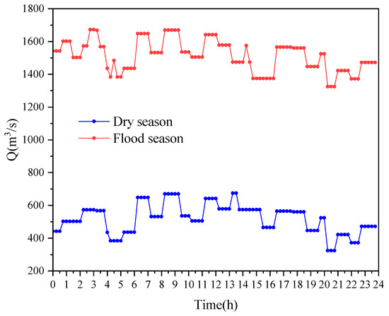Considering the obvious difference in the operation of hydropower stations between flood and dry conditions, two situations are employed to simulate the dry and flood seasons. A starting water level of 2178 m and a mean daily inflow of 674 m3/s were set during the dry season, and a starting water level of 2163 m and a mean daily inflow of 1324 m3/s were considered during the flood season. The inflow process intraday quarter-hourly data collected from a hydropower located in Western China are shown in Figure 6.