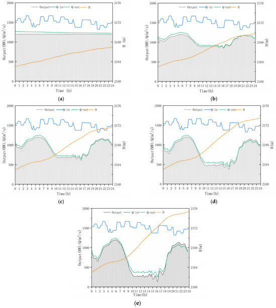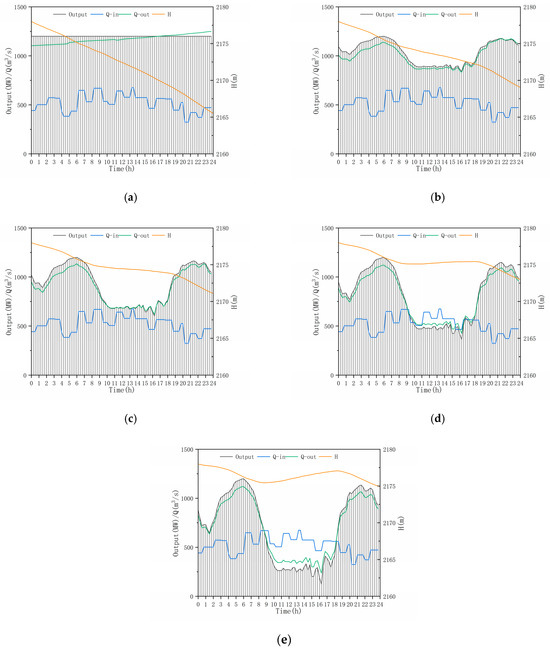 Given a renewable energy penetration of 0% (Figure 7a), the hydropower output always reached the 1200 MW high output status, and the inflow was lower during the dry season. The outflow was always higher than the inflow, which resulted in a continuous drop in the reservoir water level, causing the hydropower efficiency to gradually decrease, and the outflow gradually increased.