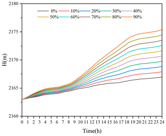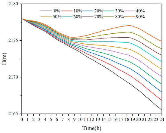 In the scheduling process, the reservoir water level process trend remained the same. Similarly, scheduling process main parameter Scenario C was selected as an example. Figure 8 shows the reservoir water level process under the different renewable energy penetrations of Scenario C. Given a renewable energy penetration of 50% and below, the reservoir water level gradually decreased, and, with increasing renewable energy penetration, the decline rate gradually declined. Above 50%, the reservoir water level first decreased, then increased, and, finally, decreased.