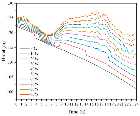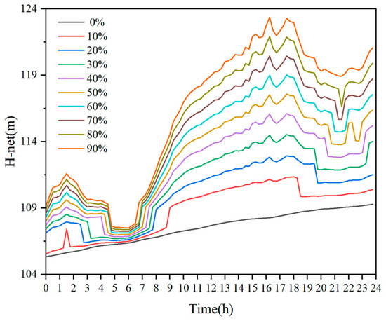 The obvious differences from the dry season are that the flood season starting water level is low and the inflow is higher. The inflow is always higher than the outflow, so all scenarios of reservoir water levels under all renewable energy penetrations always increases (Figure 11), and the net water head basically exhibits an upward trend (Figure 12). Moreover, the net water head is affected by the tailwater level and the water head loss, both of which are influenced by the outflow, and the most important factor of the outflow is the output. Therefore, there occurs a certain decrease in the net water head during the period when the hydropower output is higher (3:00 to 8:00 and 20:00 to 24:00).