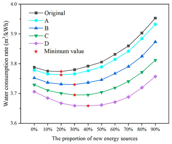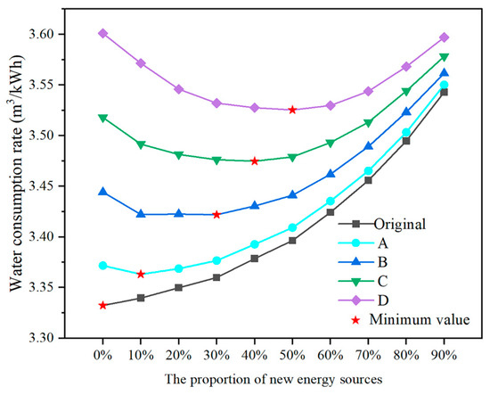 - With increasing renewable energy penetrations, the daily water consumption rate mostly displays a trend of first decreasing and then increasing. During the dry season, the lowest values of the water consumption rate under the Original, A, B, C, and D scenarios were 3.33, 3.36, 3.42, 3.47, and 3.53 m3/kWh, and the renewable energy penetration at the lowest point under each scenario was 0%, 10%, 30%, 40%, and 50%, respectively. During the flood season, the lowest values of the water consumption rate under the Original, A, B, C and D scenarios were 3.77, 3.76, 3.73, 3.70 and 3.66 m3/kWh, and the renewable energy penetration at the lowest point under each scenario was 20%, 20%, 30%, 30%, and 40%, respectively.