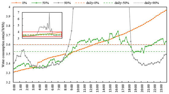 The phenomenon of the lowest point occurs during both the dry and flood seasons. Scenario D was selected during the dry season as an example, and renewable energy penetrations of 0%, 50%, and 90% of the operation process are marked in the net water head–output–water consumption rate graph, as shown in Figure 16. The water consumption rate processes for the three scenarios are shown in Figure 17.