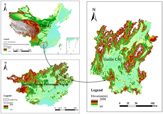 Guilin is located in the southwestern part of the Nanling Mountains, at the southern end of the Xiang-Gui Corridor, in the northeastern part of the Guangxi Zhuang Autonomous Region. The city lies between longitudes 109°36′50″–111°29′30″ E and latitudes 24°15′23″–26°23′30″ N, with a total length of 236 km from north to south and a width of 189 km from east to west, as shown in Figure 1.
