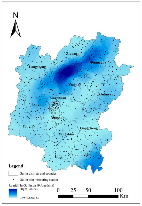 From 12 to 19 June 2024, Guilin experienced continuous heavy rainfall, with 38 meteorological stations breaking their all-time 24 h rainfall records. At 8 o’clock on 12 June, the Guilin Hydrology Center observed that under the influence of heavy rainfall, the Guijiang River, Luoqing River, Xiangjiang River, Guyi River, and Zijiang main tributaries had a rising process of 0.3–1.1 m. On 17 June, due to the heavy rain, water levels in the Li River Scenic Area rose, and a notice was issued to suspend navigation. On 19 June, continuous heavy rainfall and the release of water from upstream reservoirs caused rapid rises in water levels along major rivers in Guilin, Guangxi. By 17:00, the water level at Guilin hydrological station reached 148.55 m, surpassing the 148.4 m of the 1998 Li River severe flood, exceeding the warning level by 2.55 m, marking the largest flood in Guilin since 1998. The rainfall on 19 June is shown in Figure 2, which was generated using Kriging interpolation based on data from Guilin’s rainfall stations. On that day, the main urban area of Guilin suffered severe urban waterlogging, with many scenic spots closed, bus routes suspended, some schools closed, and the Liu Pi Ma Scenic Area submerged with power outages in nearby areas. Parts of Provincial Road 301 in Quanzhou County collapsed, blocking traffic, with five bus routes suspended and twenty-one others rerouted or shortened. At Guilin Station, water accumulation affected passenger movement, and passenger services were temporarily moved to Guilin North Station, with some trains either suspended or running at reduced speeds. On the evening of 19 June, the Guilin Flood Control and Drought Relief Command announced that the period from 12 to 19 June had seen continuous heavy rainfall, breaking rainfall records at 38 meteorological stations. Normal operations resumed at Guilin Station on 21 June.
