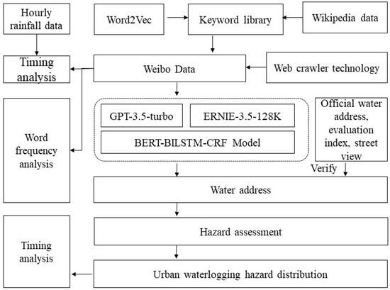 The processing of Weibo data is divided into two main aspects. First, a temporal analysis is conducted with hourly rainfall data to explore the relationship between the number of posts and the average hourly rainfall, and daily Weibo data are analyzed to extract thematic keywords and perform word frequency analysis. Second, urban waterlogging addresses are extracted separately using the BERT-BILSTM-CRF model, the GPT-3.5-turbo model, and the ERNIE-3.5-128K model from Weibo data. The extracted addresses are compared with officially reported urban waterlogging locations, and 10% of the samples are randomly selected for manual annotation to calculate evaluation metrics and compare the performance of the three methods. Finally, the model that performs well is validated with additional urban waterlogging points using street view images.