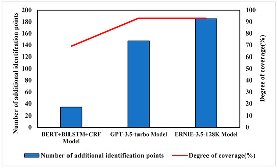 According to Figure 5, the GPT-3.5-turbo and ERNIE-3.5-128K models significantly outperform the BERT-BILSTM-CRF model in the task of place name extraction. Both models have a coverage rate of 93%, which is much higher than the 69% coverage of BERT-BILSTM-CRF. Additionally, in terms of additional identified points, GPT-3.5-turbo and ERNIE-3.5-128K identified 147 and 185 more place names, respectively, highlighting their advantage in place name recognition. It may be because the BERT-BILSTM-CRF model only performs well in the recognition of commonly familiar names in microblog data (such as Guangxi Province, Guilin City), but it does not perform well in the accuracy of township roads, hospitals, and villages, resulting in reduced recognition accuracy (as shown in Table 3). Despite the high coverage rates of the GPT-3.5-turbo and ERNIE-3.5-128K models, they did not achieve 100% coverage, which may be related to the models being lower versions (3.5) and their limitations when processing larger text data. When there are too many place names in a Weibo post, the models may miss some of them. Regarding the additional identified urban waterlogging points, on one hand, the official data only covers road urban waterlogging conditions and does not include all areas of Guilin, so the identification of urban waterlogging points outside of roads further validates the feasibility of the approach. On the other hand, large language models (GPT-3.5-turbo and ERNIE-3.5-128K) tend to exhibit a certain degree of “overconfidence” [27,28,29], which may lead to over-predictions, such as generating addresses that are not actually mentioned in the Weibo post. In contrast, the BERT-BILSTM-CRF model identifies all place names, including some irrelevant to urban waterlogging.
