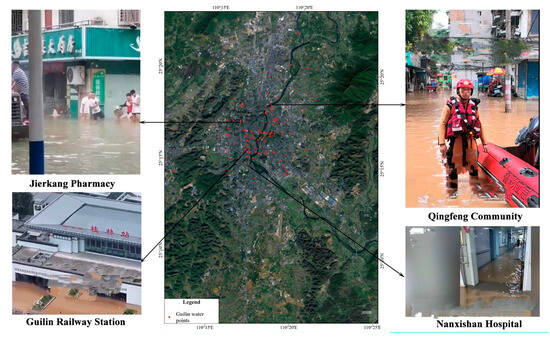 This paper comprehensively summarizes the road urban waterlogging situations in Guilin City mentioned in three reports published by Guilin Daily. These reports were released on 19 June at 18:00 https://news.qq.com/rain/a/20240619A0831000 (accessed on 22 June 2024), 20 June at 7:30 https://news.qq.com/rain/a/20240620A00YUA00 (accessed on 22 June 2024), and 21 June at 10:00 https://news.qq.com/rain/a/20240621A02RA600 (accessed on 22 June 2024), and they provided detailed information on the urban waterlogging conditions in various districts and streets. Based on this official data, we evaluated the coverage of the urban waterlogging points extracted by the three methods.