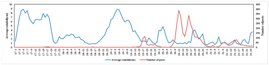 By visualizing the hourly rainfall data and Weibo post data in Guilin, the results are presented in Figure 8. The blue curve represents the average rainfall (in cm), while the red curve represents the number of Weibo posts. It can be observed that on 17 June, rainfall rapidly rose to a peak. At this time, although the number of Weibo posts was relatively low, it showed a slight increase. From 18 June to midday on 19 June, rainfall reached another peak, accompanied by a significant increase in Weibo posts. Notably, the peak in Weibo posts occurred after the peak in rainfall, suggesting that users may have started actively posting in response to issues such as urban waterlogging and traffic disruptions caused by sustained heavy rainfall.