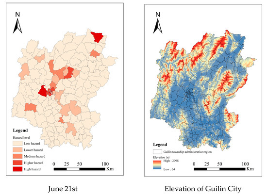 The information on urban waterlogging points extracted from daily Weibo data was visualized at the township level to assess urban waterlogging hazards (see Figure 9). As shown in Figure, from 17 to 18 June, the urban flood hazard in Guilin was generally low, with only a few towns, such as Lingui Town, experiencing lower hazard levels. However, after the heavy rainfall on 19 June and the continuous rainfall from 20 to 21 June, high-hazard towns appeared in the city center on 19 June, while suburban areas saw medium hazards. From 20 to 21 June, the flood hazard in Guilin intensified, with higher- and high-hazard areas in the city center gradually expanding to the suburbs. Some suburban towns also shifted to high-hazard status, leading to a further deterioration of the urban flooding issue. Combined with an analysis of Guilin’s elevation data, it is evident that the northwestern and southeastern parts of Guilin, characterized by mountainous and higher terrain, mostly remained in low-hazard states.