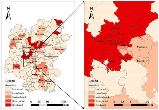 Distribution of urban waterlogging hazard intensities at township scale on 19 June in Guilin City.