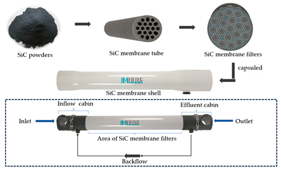 In the past decade, silicon carbide (SiC) material has attracted increasing attention in the domain of sensors, electronic chips, microreactors and energy exchangers [1]. Attributed to exceptional physical–chemical properties like high hardness, and chemical stability as well as superior resistance to corrosion and fouling, SiC has emerged as a leading material in the development of advanced inorganic membrane technologies [2,3]. In comparison to the traditional inorganic or organic membranes made from aluminum oxide or high-molecular polymers [4], the SiC-based inorganic membranes have played a transformative role in solving the long-standing challenges in industrial separations under various harsh conditions [5], such as extreme acidity or alkalinity environment, high content of HF acid, high-lipid oily substances, and high concentrations of organic solvents. Regarding the extraordinary performance and properties [2], SiC-based membranes are considered the next generation of filtration materials.