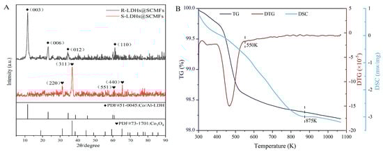The thermal analysis of R-LDHs@SCMFs is illustrated in Figure 2B. The TG curve shows a significant weight loss before 550 K; meanwhile, the DTG curve highlights a major decomposition peak ranging from 385 K to 550 K. The two mass-related curves are attributed to the removal of interlayer water and surface-bound hydroxyl groups in the Co/Al-LDHs structure [16,17]. With the temperature elevated, the weight loss is slightly decreased accompanied by an endothermic peak at 875 K (~600 °C) in the DSC curve, which is caused by the dehydration of the OH to cobalt and aluminum ions [18,19].