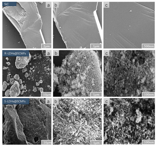 Figure 3. The SEM images of SiC, R-LDHs@SCMFs, and S-LDHs@SCMFs. Subfigures (ac) denoted specimens were observed under various magnification times.