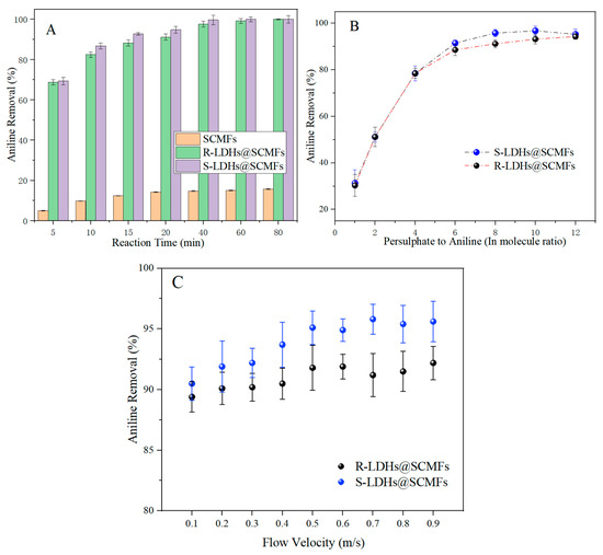 The impact of the P:A ratio on aniline removal efficiency was evaluated at a constant reaction time of 20 min and a flow velocity of 0.7 m/s, as shown in Figure 4B. One may notice both R-LDHs@SCMFs and S-LDHs@SCMFs demonstrate a consistent increase in aniline degradation efficiency as the P:A ratio rises. At a P:A ratio of 8:1, R-LDHs@SCMFs and S-LDHs@SCMFs achieve approximately 91.2% and 94.8% removal efficiencies, respectively. However, further increasing the P:A ratio beyond 8:1 leads to marginal improvements in removal efficiency. Therefore, the P:A ratio of 8:1 is adequate for achieving high removal efficiency with S-LDHs@SCMFs, balancing reagent consumption with treatment efficacy. The influence of flow velocity is shown in Figure 4C, with the reaction time and P:A ratio fixed at 20 min and 8:1, respectively. Both R-LDHs@SCMFs and S-LDHs@SCMFs exhibit increasing removal efficiency as the flow velocity rises. As the flow velocity is higher than 0.7 m/s, no significant improvement in aniline removal efficiency is obtained, indicating that optimal persulphate activation and aniline degradation are achieved at this condition [19,20].