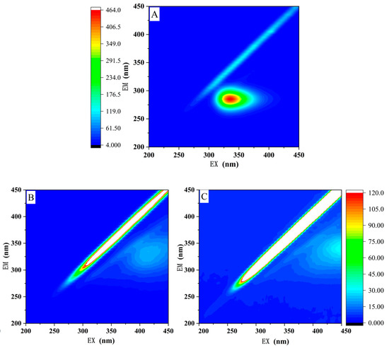 Figure 5. The 3D EEM fluorescence pattern of (A) the simulated aniline wastewater (100 mg/L) and the effluent of (B) R-LDHs@SCMFs and (C) S-LDHs@SCMFs, where (B,C) are both obtained under 8:1 of P:A ratio and 0.7 m/s of flow velocity, and 60 min of reaction time.