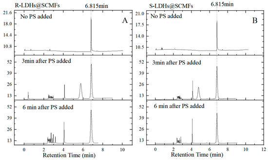 Figure 6. GC chromatography measurement (A) of R-LDHs@SCMFs and (B) S-LDHs@SCMFs operated at the early stage of reaction, where the P:A ratio and flow velocity are constant as 8:1 and 0.7 m/s; more details of the GC chromatography examination are elucidated in S4.
