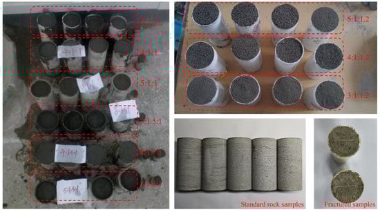 Due to the small hydraulic conductivity of natural rocks, it is difficult to conduct indoor permeability experiments, and artificial large fractures in rocks are widely adopted []. Porous media were used in this paper to obtain relevant experimental parameters, on the basis of keeping the porosity and particle size ratio of artificial rocks and natural rocks approximately the same. By changing the water–cement ratio of the simulated material (sand, cement, and water), the rock hydraulic conductivity was amplified so as to ensure the normal conduct of the experiment without seriously affecting the experimental results. In the selection of simulated materials, the sand was filtered by sieve method from river sand (particle size was about 0.1–0.2 mm), the cement was ordinary Portland cement, and the sample was prepared. By adjusting the water-cement ratios of different rock samples, which were X:1:1, X:1:1.2, X:1.5:1 (X being 3, 4, and 5), fine sandstones with different cementation degrees and different sand content were simulated so as to obtain the permeability changes of various sandstones at different temperatures. Three sets of rock samples with different water–cement ratios are shown in Figure 1. To accurately obtain the experimental results, the diameter of the samples was 75 mm and the length 150 mm, and they were dried for 7 days after sample formation for the experiment. To establish a similar connection between the artificial rock samples and the natural rocks, rock core obtained from drilling of the 5301 working face of Zhaolou Coal Mine was used, and rock with the lithology of fine sandstone was selected to make standard samples with a diameter of 75 mm and a length of 150 mm. Four rock samples were made (Table 1).