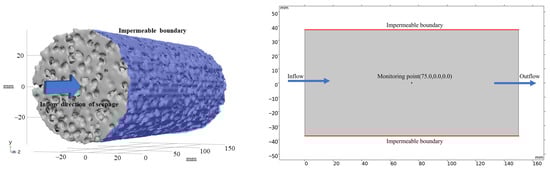 The prototype of the 3D model is a 150 mm × 75 mm cylindrical rock. Water flows in from the left side of the rock and flows out from the right side. The surrounding area is sealed by concrete, and only the seepage inlet and outlet surfaces are retained. The schematic of the model is shown in Figure 4. The inlet pressure was applied at different temperatures to observe the changes in percolation parameters. The rock is considered to be a homogeneous porous media, the reference rock is sandstone, and the physical fields selected are Darcy seepage and porous media heat transfer module. The experimental temperature was selected to be 30–80 °C, regardless of the changes in the rock mass skeleton and solid particles under the influence of temperature. According to the experimental model, the upper and lower boundaries were set as impermeable boundaries; the left boundary was the pressure boundary entrance, and the right side was the exit. According to the experimental model, the rock as a whole was immersed in hot water, so there was a variable temperature boundary around it, and the boundary at the outlet was not in contact with hot water. The normal temperature boundary was set at 20 °C, and the duration of this simulation was set at 600 min for full heating. The porous media is isotropic, so to observe the changes in the relevant seepage parameters, the central point of the entire core was selected as the monitoring point (X: 75 mm, Y: 0 mm, and Z: 0 mm) (Figure 4), and the tangential hydraulic conductivity and Darcy velocity changes with the inlet temperature and pressure were observed.