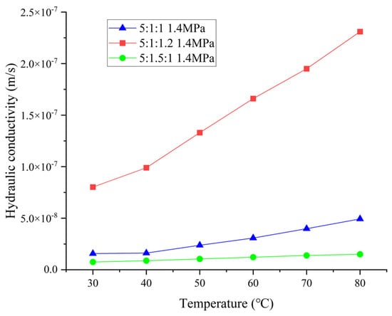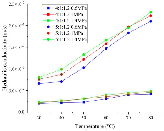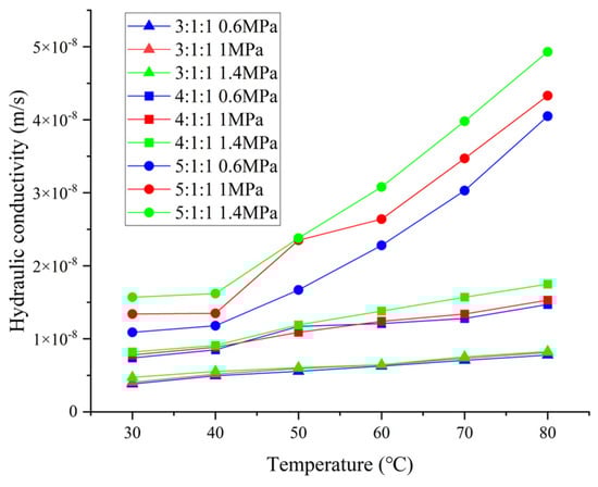 According to the preset ratio, the hydraulic conductivity of the three groups of rock samples (with ratios of X:1:1, X:1:1.2, and X:1.5:1) was tested at different temperatures, respectively, under inlet pressures of 0.6 MPa, 1.0 MPa, and 1.4 MPa, and the variety graphs of the hydraulic conductivity with temperature were obtained (Figure 5, Figure 6 and Figure 7). The rock sample with 3:1:1.2 ratio was not obtained due to its low permeability during the laboratory experiment, and the rock sample with 3:1.5:1 ratio was not obtained due to its low water pressure permeability at 0.6 MPa. Moreover, to make longitudinal comparisons between the three groups of rock samples, rock samples of different ratios (5:1:1, 5:1:1.2, and 5:1.5:1) with the same sand content under the same inlet pressure (1.4 MPa) were compared, and the comparison results are shown in Figure 8.