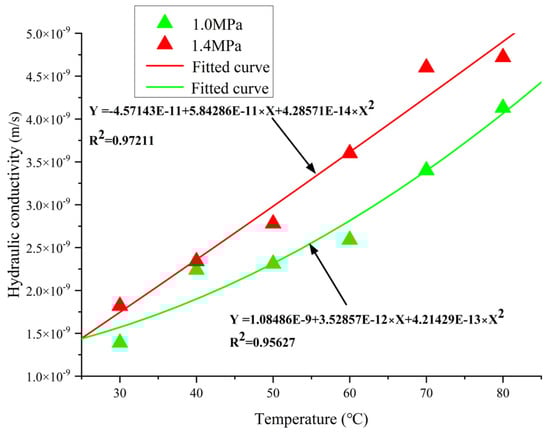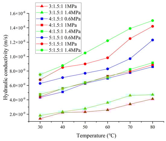 Figure 13 shows that the hydraulic conductivity of the artificial rock sample with the ratio of 3:1.5:1 shows a change rule similar to that of Equation (8) after fitting. The fitting equation shows that the corresponding value of rock samples with different ratios will also be different, indicating the difference in permeability of rock samples with different ratios. At the same time, the hydraulic conductivity of the 3:1.5:1 rock sample at 80 °C is 2.27 times higher than that tested at 30 °C, which is very consistent with the theoretical analysis. The results of this experiment are explained from the perspective of the influence of temperature on the physical properties of water, and it is believed that the influence of temperature on the hydraulic conductivity of rock is as follows: it is mainly reflected in the influence on the kinematic viscosity of water, which manifests as an increase in the hydraulic conductivity of rock samples.