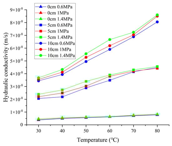 - When the artificial fracture factor is added to the supplementary rock samples, the seepage form inside the rock samples will change, but the regularity of the final results was the same as the previous three groups of rock samples, which all show that the hydraulic conductivity increases with the increase in temperature. It can be considered that the influence of temperature on the permeability of rock samples is independent of the way of fluid penetration. By comparing the hydraulic conductivity of rock samples with different fracture lengths, when the fracture L = 10 cm of the rock sample, the tested hydraulic conductivity was larger than that of the rock sample with L = 5 cm, and when the fracture L = 5 cm, the hydraulic conductivity was larger than that of the conventional rock sample (Figure 9), indicating that the lengthening of the fracture extends the flow channel of seepage in the fracture. Moreover, it is easier to flow in fractures than in pores, so the permeability capacity of the rock samples becomes stronger with the growth of fractures.