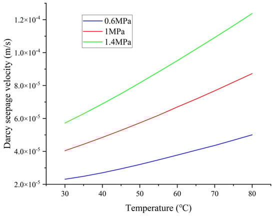 - Darcy seepage velocity increases with the temperature and also with the inlet pressures (Figure 10). It is well understood that both temperature and pressure contribute to hydrodynamic strengthening. However, the increase in inlet pressure causes the increase in Darcy’s seepage velocity but does not change the hydraulic conductivity, which is related to the boundary conditions set in this simulation. When the outlet pressure is 0, the hydraulic slope will increase with the increase in inlet pressure. According to Equation (2), the increase in hydraulic slope will cause an increase in seepage velocity. However, the seepage velocity will increase with the increase of water temperature. When the inlet pressure is unchanged, its hydraulic gradient is unchanged, and the reason for the seepage velocity increasing is the increase in its hydraulic conductivity. Therefore, the hydraulic conductivity and Darcy’s seepage velocity show the same trend as the water temperature. To sum up, the hydraulic conductivity depends on the physical properties of the rock itself and the parameters related to the water temperature, while the seepage velocity has more hydraulic slope influence than the hydraulic conductivity, so the two may not necessarily change simultaneously.