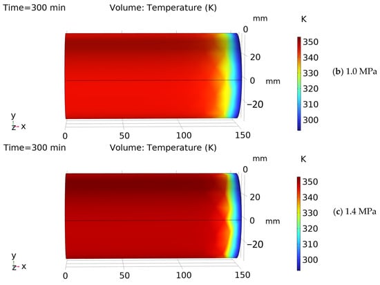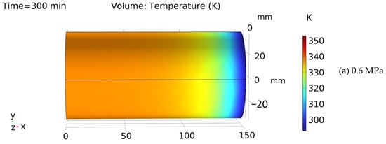 In the simulation process, it was noted that different water inlet pressures had an effect on the heating process of rocks. Figure 11 shows the temperature rise of rock mass under different injection pressures at 300 min.