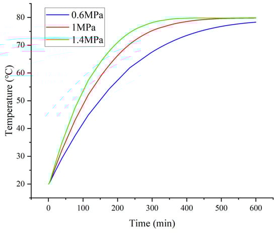 The time required for the monitoring point of rock to be heated to the corresponding temperature varies with the inlet pressures. Figure 12 shows the temperature change of the monitoring point when the external heating temperature is 80 °C. At 600 min, the temperature of the rock basically reaches the external heating temperature. The initial conditions of the three curves only change the inlet pressures, and other parameters do not change.