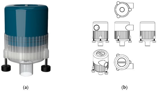The developed laundry wastewater filter was manufactured to filter approximately 15 L/min of washing machine wastewater. It was manufactured as a four-stage filtration system that can remove microplastics, suspended solids, and other contaminants. Before manufacturing the product, it was designed as shown in Figure 1 to remove microfibers step by step through the cyclone water flow.