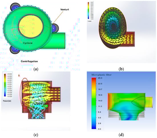 After designing the product, modeling was performed using Soildworks 2024 to evaluate the performance of the product and check the water flow of the virtual product, as shown in Figure 2. In the results, it was confirmed that the product was designed in a circular shape, and the physical separation occurred quickly due to the acceleration and gravity generated from the high flow rate from the centrifuge, which increased the removal efficiency of microplastics and suspended solids.