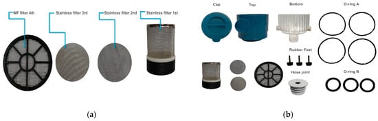 Based on the modeling results, the laundry wastewater filter was manufactured as shown in Figure 3. The filter parts were designed and manufactured by dividing them into four filter nets, a part connected to the washing machine, and a part connected to the drain. The primary filter is a net-shaped woven wire made of stainless steel 304 with a pore diameter of 1270 μm. The secondary filter is also made of stainless steel 304 and has a pore diameter of 508 μm. The tertiary filter is also made of stainless steel 304 and has a pore diameter of 100 μm. The 4th filter is a 0.3 μm filter made of glass fiber. All filters are designed and custom-made according to the dimensions. The manufactured product can be inserted directly into the sewage outlet and connected to the washing machine drain hose. The water discharged from the washing machine passes through the developed filter and flows out to the sewage outlet.