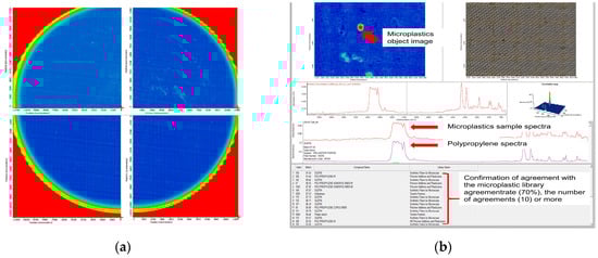 Figure 4 shows microplastic analysis sequence using μFTIR. FTIR microscopy analyzes one quarter of a 25 mm mass filter at a time, and the entire filter is analyzed four times. The number, material, and length of microplastics in the analyzed filter were confirmed using FTIR microscope software. The type of microplastic was determined based on the FTIR spectra data provided by the FTIR software. The plastic type criterion is determined to be a specific plastic type if the match rate is 70% or higher and the same plastic is found more than 10 times. The size of microplastics was measured by their longest length (maximum ferret diameter) [22].