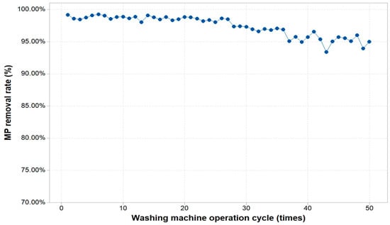 The experiment on microplastics in laundry wastewater was conducted 50 times with 5 kg/load of laundry after installing the developed filter at the rear of the washing machine. The results are shown in Figure 5.