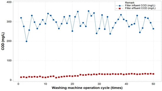 During the 50 experiments, the COD of the washing water flowing out before using the filter was confirmed to be a maximum of 335 mg/L, a minimum of 119 mg/L, and an average of 296 mg/L, which was significantly different for each wash in Figure 9. The COD of the washing wastewater flowing out after the microplastic filter was confirmed to be a maximum of 33 mg/L, a minimum of 13 mg/L, and an average of 25 mg/L, and it was confirmed not to be changed much. The COD removal efficiency of the developed filter was confirmed to be an average of 92%.