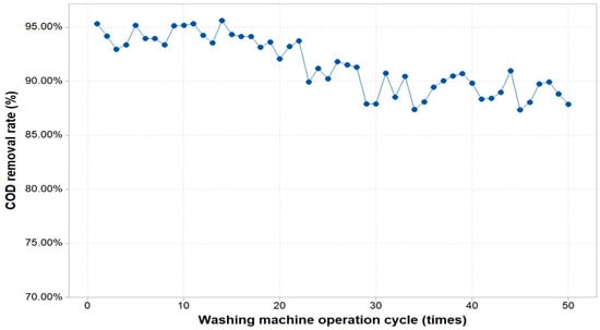 Figure 10 shows that the COD removal efficiency decreases slightly as the number of washes increases. However, it was determined that the COD removal efficiency remains above 87% even after 50 washes.