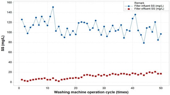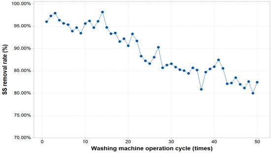 In Figure 11, the SS before the filter of the laundry discharge water after 50 experiments was confirmed to have a large fluctuation, with a maximum of 151 mg/L, a minimum of 79 mg/L, and an average of 110 mg/L. The SS of the laundry discharge water after filtration through the developed filter was confirmed to have high removal efficiencies, with a maximum of 21 mg/L, a minimum of 2 mg/L, and an average of 12 mg/L. Accordingly, the SS removal efficiency using Equation (3) was determined and was shown in Figure 12. The SS removal rate after using the laundry filter was confirmed to be high, with an average of 89%. It was confirmed that the SS removal efficiency was maintained at a high level of over 80% even after using the developed laundry filter more than 50 times. This is a technology that can reduce the SS of laundry wastewater by 80%, which can reduce the amount of coagulant used in sewage treatment plants.