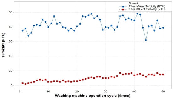 Turbidity is a basic standard that can be used to simply measure water quality by checking the degree of turbidity of a liquid. As a result of 50 experiments, the turbidity of the wash water before using the filter was confirmed to be a maximum of 98 NTU, a minimum of 62 NTU, and an average of 84 NTU, with a maximum difference of 36 NTU, as shown in Figure 13. The turbidity of the laundry discharge water after the filter was confirmed to be a maximum of 17 NTU, a minimum of 2 NTU, and an average of 10 NTU, with a maximum difference of 15 NTU. Accordingly, by applying Equation (4), the turbidity removal efficiency was confirmed to be an average of 88%.