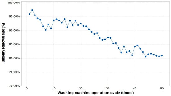 In Figure 14, the turbidity removal rate began to fall below 90% in the 25th cycle and showed a removal efficiency of 81% in the 50th cycle. The highest SS removal efficiency was 97% in the 2nd cycle, and the minimum efficiency was confirmed to be 81% in the 39th cycle. The minimum efficiency of 81% can be considered high efficiency considering the SS concentration of the washing water going to the sewage treatment plant. Accordingly, it was confirmed that the turbidity removal of the filter maintained high efficiency even after 50 test cycles.